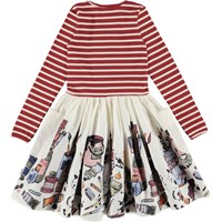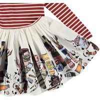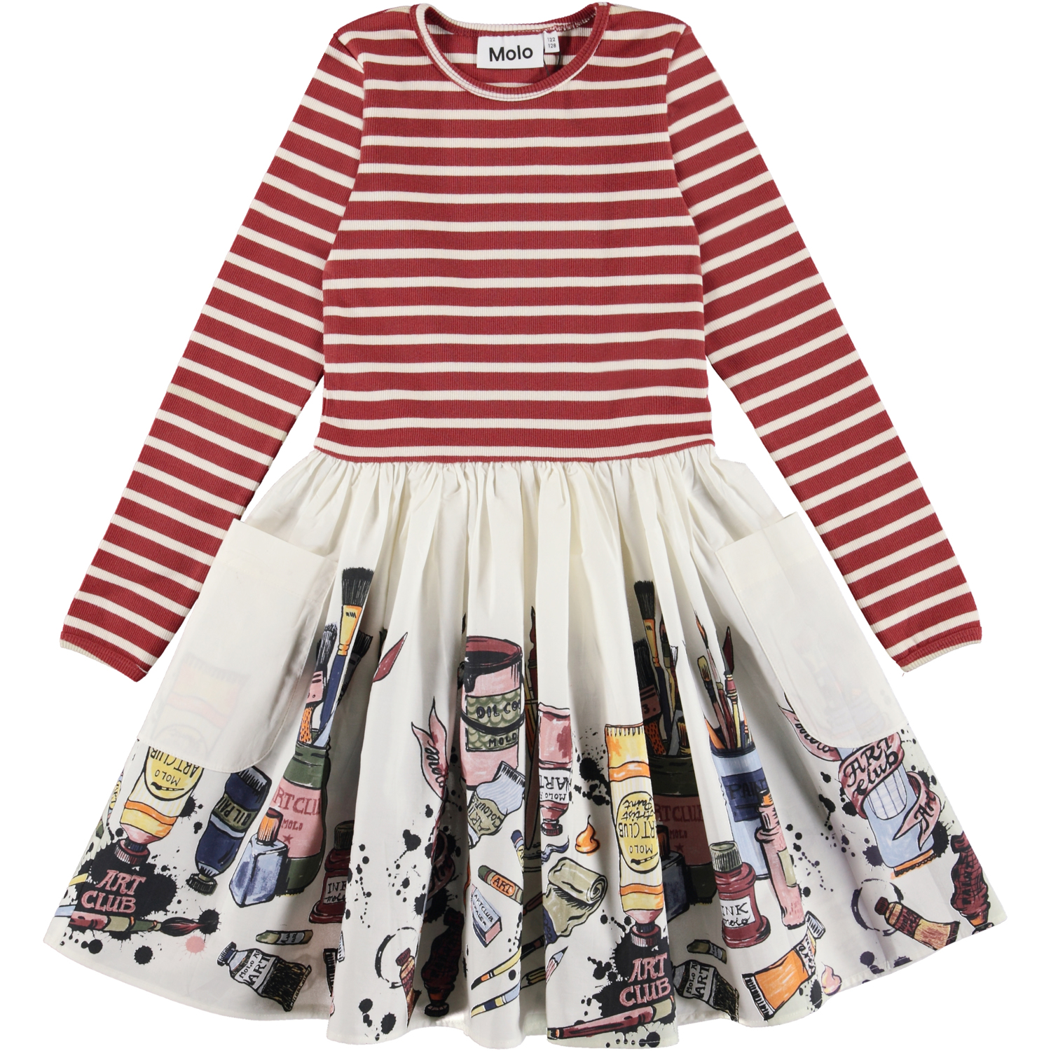 Casie ist ein Kleid mit rot-weiß gestreiftem Oberteil aus Rippstrick mit langen Ärmeln und einem femininen Popeline-Rock in Weiß mit Druck von Pinseln und Farbtuben. Das Kleid hat große Außentaschen am Rock.
