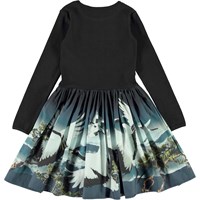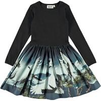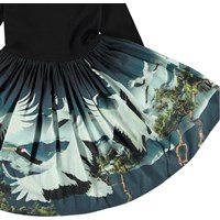 Casie ist ein zweiteiliges Kleid mit schwarzem geripptem Oberteil, langen Ärmeln und einem Rock mit Kranichen.