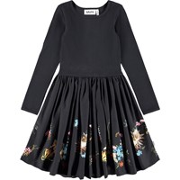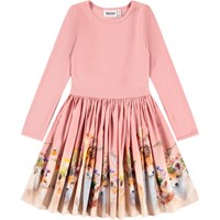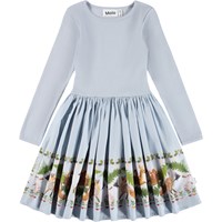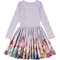Langärmeliges hellviolettes Kleid aus Öko-Baumwolle mit einem eng anliegenden gerippten Jersey-Oberteil und einem Popeline-Rock. Das Kleid hat eine normale Passform mit einem Druck von Tieren, die Kleidung tragen, auf dem Rock.