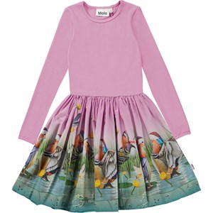 Cissa ist ein pinkes, langärmliges Kleid mit rund geschnittenem Rock aus Öko-Baumwolle. Oben ist Cissa ein gerippter Jersey, während die Unterseite aus Baumwollpopeline besteht. Auf dem Rock ist eine Szene aus dem schönen Teich mit Seerosen und exotischen Vögeln aufgedruckt.