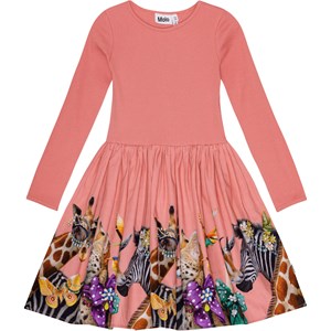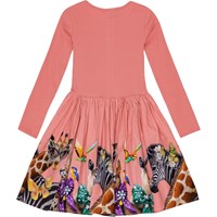 Langärmeliges korallfarbenes Kleid aus Öko-Baumwolle mit einem eng anliegenden gerippten Jersey-Oberteil, Rundhalsausschnitt und einem voluminösen, kreisförmig geschnittenen Rock aus Baumwollpopeline. Der Rock ist mit einem bunten Druck von festlichen Tieren verziert, die mit Schleifen, Brillen und Diamanten geschmückt sind.
