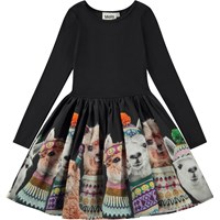 Schwarzes knielanges Kleid mit rund geschnittenem Rock aus Popeline mit Print. Der Druck besteht aus niedlichen und lustigen Lamas, die voller Humor sind. Sie tragen Molos eigene Strickmodelle und haben sich gut in Mützen, Halswärmer und Pullover eingehüllt. Dieses Kleid besteht aus 100% Baumwolle, hat einen Rundhalsausschnitt mit schmalen Rippbündchen, lange Ärmel, einen Popeline-Rock mit Aufdruck und eine normale Passform.