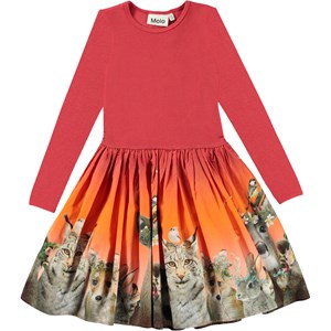 Casie ist ein rotes Kleid mit einem Oberteil aus Rippstrick mit langen Ärmeln und einem femininen Rock aus Popeline mit Aufdrucken verschiedener Tiere.