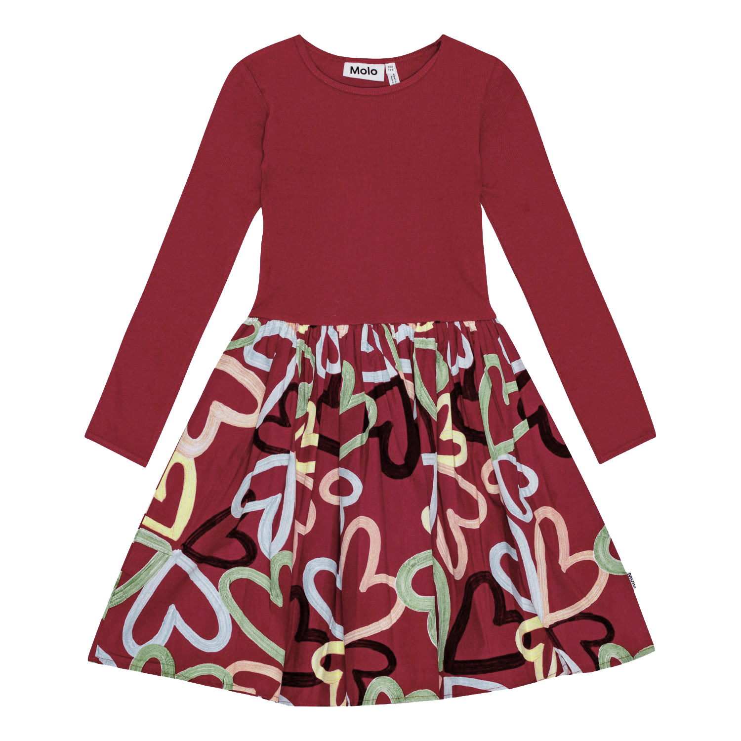 Langärmeliges bordeauxfarbenes Kleid aus Öko-Baumwolle mit einem eng anliegenden gerippten Jersey-Oberteil, Rundhalsausschnitt und einem voluminösen, kreisförmig geschnittenen Rock aus Baumwollpopeline. Der Rock ist mit einem Druck von handgemalten Herzen in verschiedenen Farben verziert, die eine Vielzahl von vierblättrigen Kleeblättern bilden.