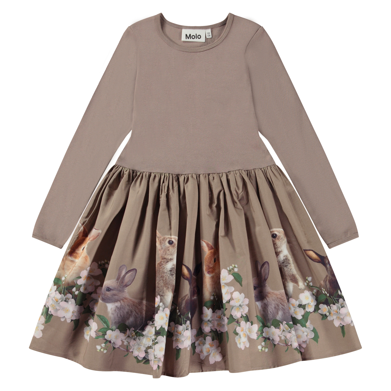Graubraunes knielanges Kleid mit rund geschnittenem Popeline-Rock mit Print. Der Druck besteht aus kleinen Kaninchen, die sich zwischen vielen Blumen amüsieren. Dieses Kleid besteht aus 100% Baumwolle, hat einen Rundhalsausschnitt mit schmalen Rippbündchen, lange Ärmel, einen Popeline-Rock mit Aufdruck und eine normale Passform.