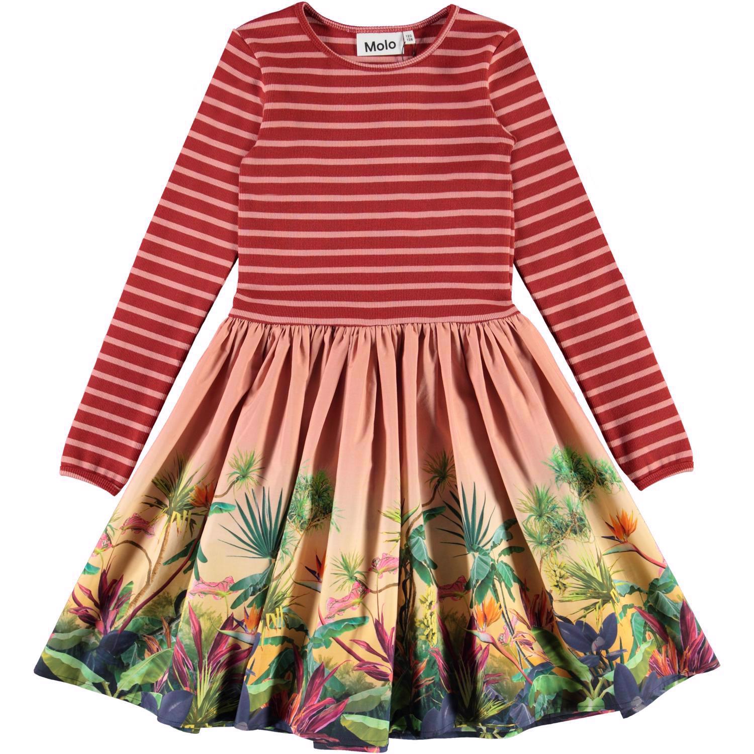 Casie ist ein Kleid mit einem rot-Rosa gestreiften Oberteil aus Rippstrick mit langen Ärmeln und einem femininen Popeline-Rock mit Prints der verschiedenen Pflanzen des Dschungels.
