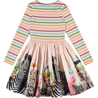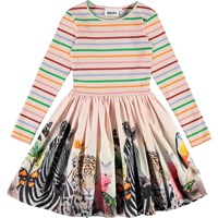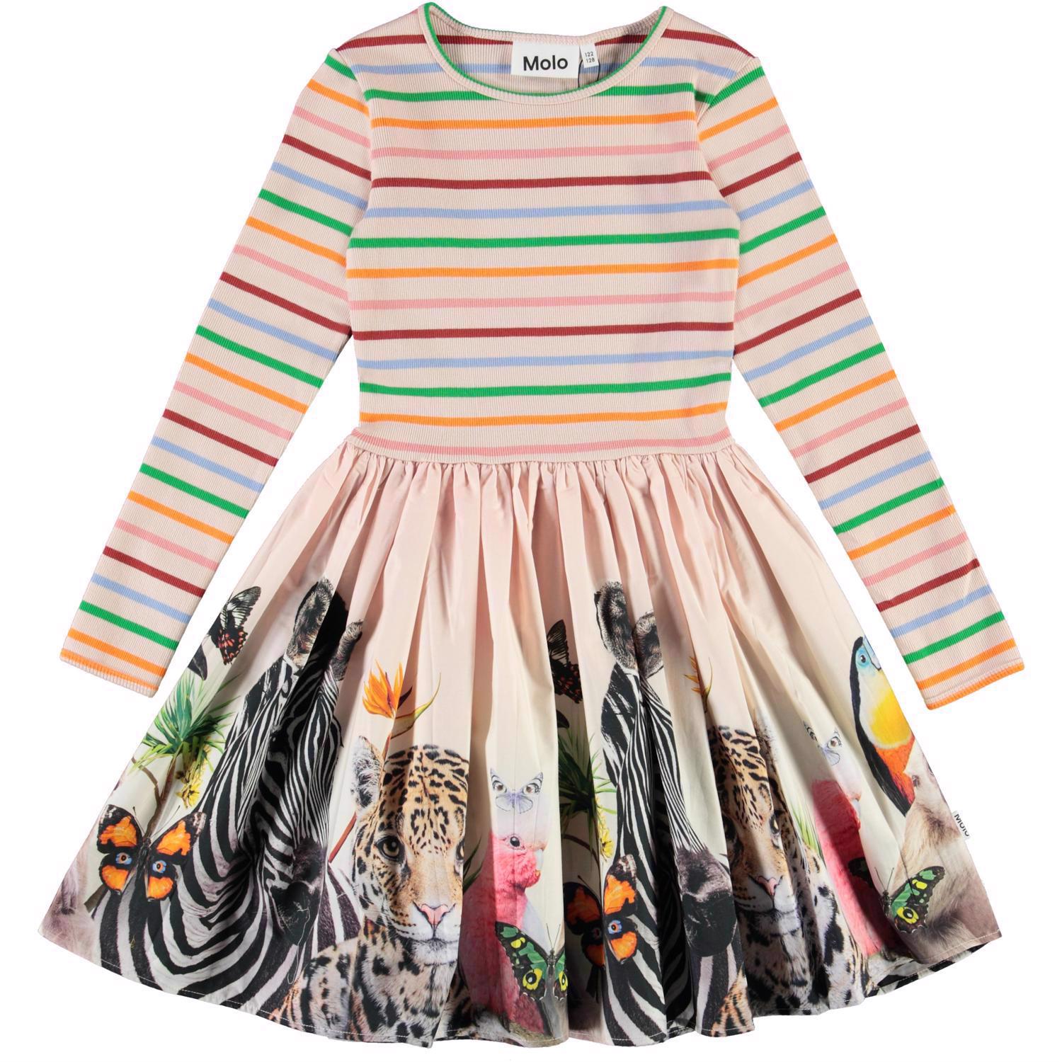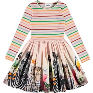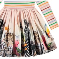 Casie ist ein Rosaes Kleid mit verschiedenfarbigen Streifen am Oberteil und ein femininer Popelinerock mit Prints der verschiedenen Tiere des Dschungels.