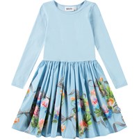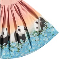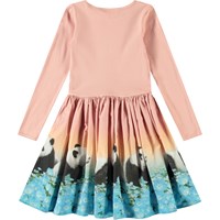 Langärmeliges rosa Kleid aus Öko-Baumwolle mit einem eng anliegenden gerippten Jersey-Oberteil und einem Popeline-Rock. Das Kleid hat eine normale Passform mit einem Druck auf dem Rock von Pandas in einem blauen Blumenfeld.