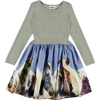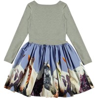 Casie ist ein zweiteiliges Kleid mit einem grauem Oberteil und langen Ärmeln. Die Unterseite des Kleides ist lila mit blumigen Pferden.