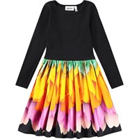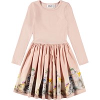 Rosa Kleid mit langen Ärmeln aus weicher, biologischer Baumwolle. Das Oberteil hat eine enge Passform aus geripptem Jersey, und der Rock besteht aus Baumwollpopeline mit einem bezaubernden Druck von Tieren mit bunten Blumenhüten. Es ist ein bequemes und festliches Kleid mit guter Bewegungsfreiheit.