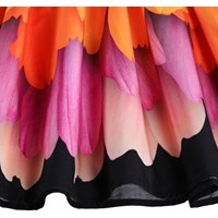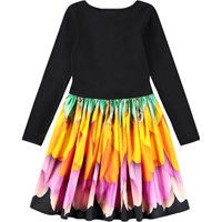 Schwarzes Kleid mit langen Ärmeln aus weicher, biologischer Baumwolle. Das Oberteil hat eine enge Passform aus geripptem Jersey, und der Rock besteht aus Baumwollpopeline mit einem bezaubernden Druck bunter Blütenblätter. Es ist ein bequemes und festliches Kleid mit guter Bewegungsfreiheit.