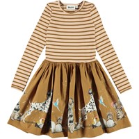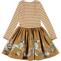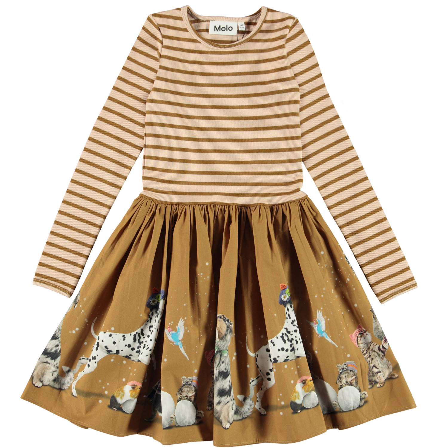 Casie ist ein braunes Kleid, bei dem das Oberteil aus Rippstrick mit rosa Streifen ist. Das Kleid hat lange Ärmel sowie einen femininen Rock aus Popeline mit aufwendigen Prints.