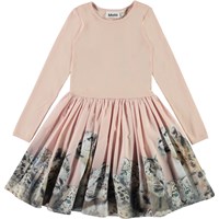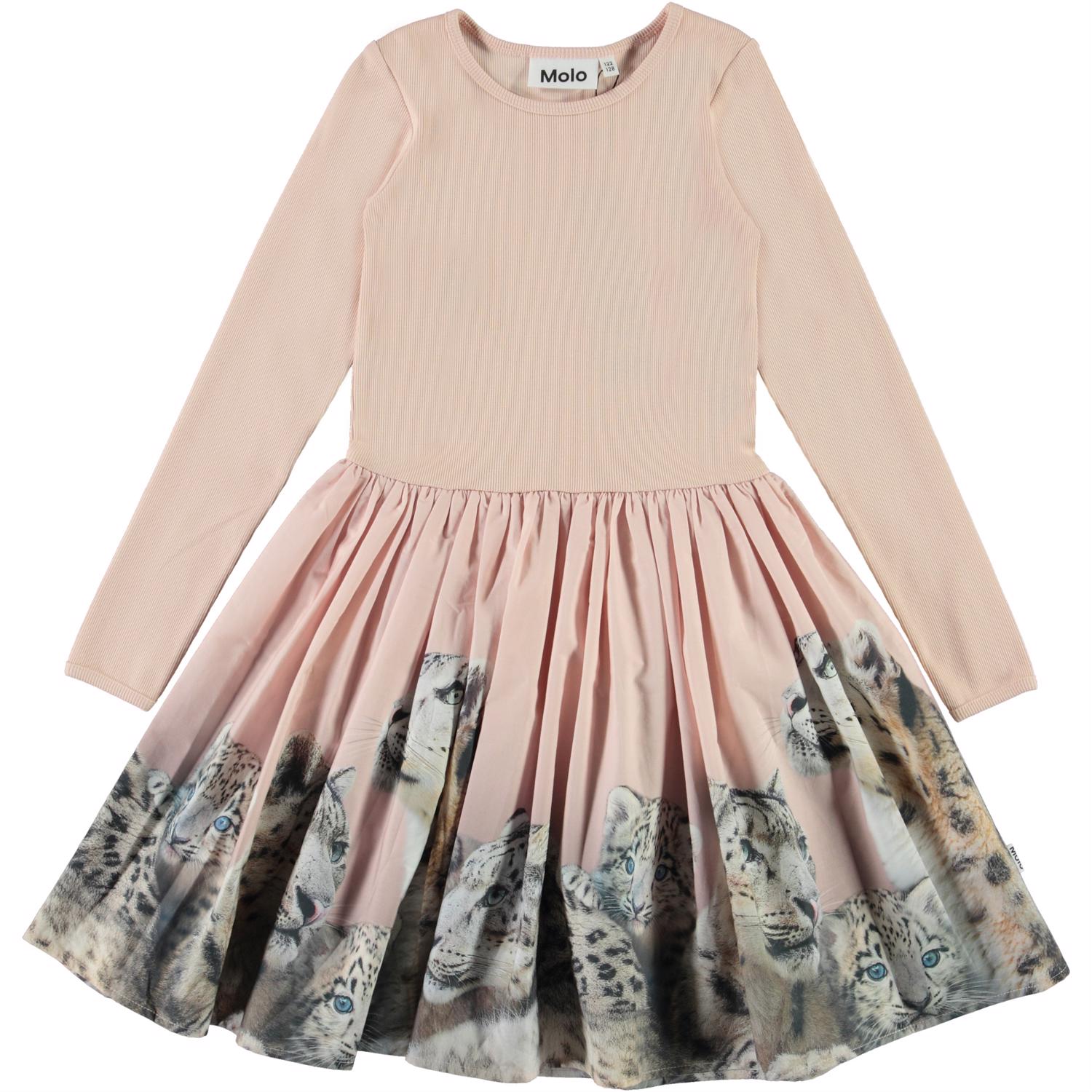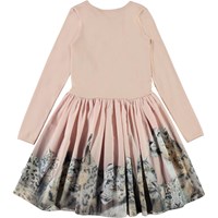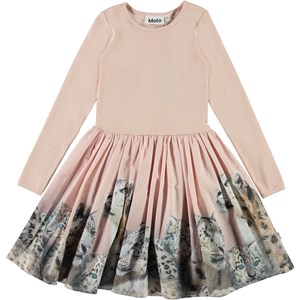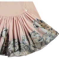 Casie ist ein zweiteiliges Kleid mit langen Ärmeln und einem rosa gerippten Oberteil. Der Rock des Kleides ist mit einem Druck von Schneeleoparden versehen.