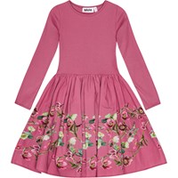 Langärmeliges puderfarbenes Kleid aus Öko-Baumwolle mit einem eng anliegenden gerippten Jersey-Oberteil, Rundhalsausschnitt und einem voluminösen, kreisförmig geschnittenen Rock aus Baumwollpopeline mit einem bunten Druck von fantasievollen Tieren wie Leopardenpferden, grünen Zebras und geflügelten Pferden.