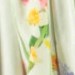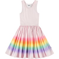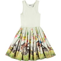 Cremefarbenes Kleid aus Öko-Baumwolle mit einem eng anliegenden gerippten Jersey-Oberteil und einem Popelinrock. Das Kleid hat eine reguläre Passform mit einem bunten Druck auf dem Rock von Blumen und niedlichen Tieren auf einer Wiese.