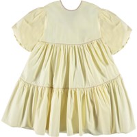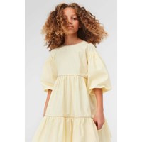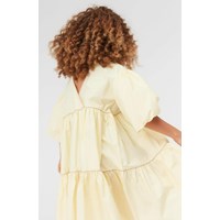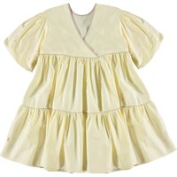 Casta ist ein hellgelbes Popelinekleid mit viel Volumen. Das Kleid hat Puffärmel, rosa Paspeln und Kantenband. Das Kleid hat ein schönes Detail am Hals, wo das Kleid in einem V abfällt.