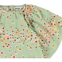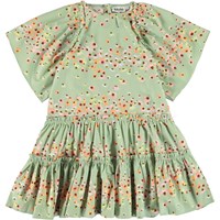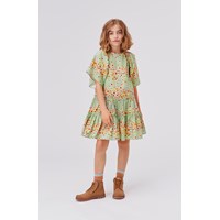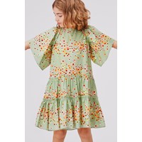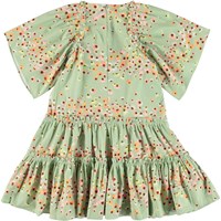 Cat ist ein grünes Kleid mit Blumendruck. Das Kleid hat große, voluminöse Ärmel und einen Reißverschluss am Hals.