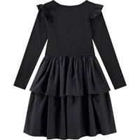 Langärmeliges schwarzes Kleid aus Öko-Baumwolle mit einem eng anliegenden gerippten Jersey-Oberteil, Rundhalsausschnitt, einer kleinen Rüsche an den Schultern und einem doppellagigen Baumwoll-Popeline-Rock, der für reichlich Falten und Volumen sorgt.
