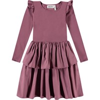 Langärmeliges lila Kleid aus Öko-Baumwolle mit einem eng anliegenden gerippten Jersey-Oberteil, Rundhalsausschnitt, einer kleinen Rüsche an den Schultern und einem Rock aus zweilagigem Baumwollpopeline mit vielen Falten und Fülle.