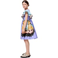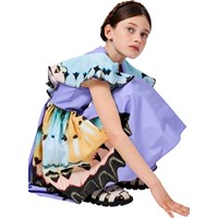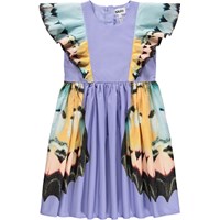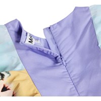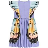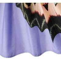 Lila Kleid aus weicher Viskose mit elegantem Schmetterlingsflügel-Print. Das Oberteil ist ärmellos mit einem Rüschenrand, der an der Taille beginnt, leicht über die Schultern fällt und auf dem Rücken weitergeht. Der Rock hat einen kreisförmigen Schnitt und ist voluminös, aus leichtem Baumwollpopeline, was dem Kleid einen leichten und luftigen Look verleiht, während ein unsichtbarer Reißverschluss an der Seite das An- und Ausziehen erleichtert.
