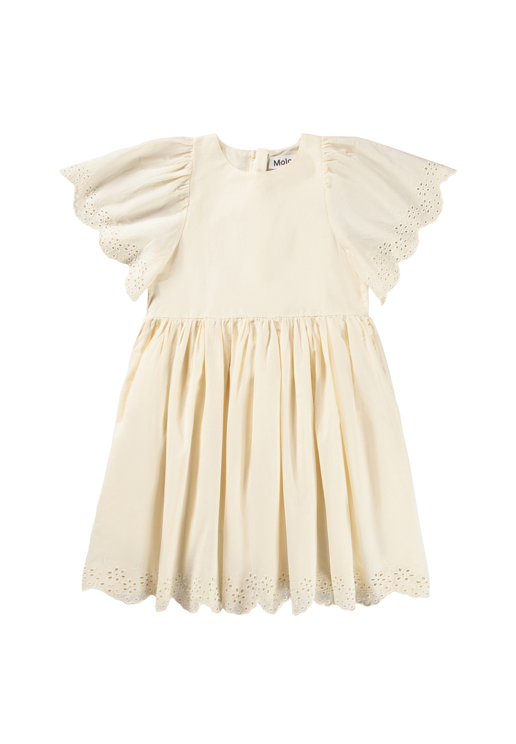Off-weißes Kleid aus weicher, ökologischer Baumwolle mit eleganter Broderie Anglaise an den Ärmeln und am Saum. Das Kleid hat einen rund geschnittenen, voluminösen Rock aus leichtem Baumwollpopeline. Das Oberteil hat weiche Schmetterlingsärmel, die sanft über die Schultern fallen, sowie einen unsichtbaren Reißverschluss am Rücken für einfaches An- und Ausziehen.