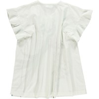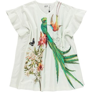Wunderschöne weiße Tunika mit Rüschenärmeln und einem Aufdruck exotischer Vögel und Blumen auf der Vorderseite. Die Tunika lässt sich mit der Badebekleidung darunter bequem für einen Tag am Strand tragen.