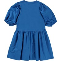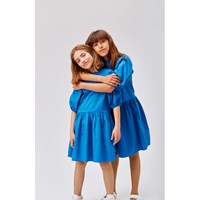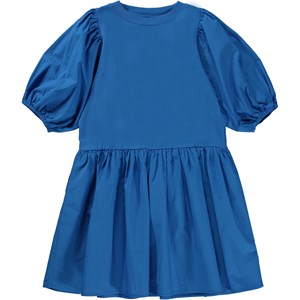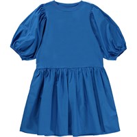 Cece ist ein dunkelblaues Kleid aus Öko-Baumwolle. Das Kleid hat eine tief sitzende Taille und Puffärmel mit Gummizug am Saum. Ärmel und Rock sind aus Öko-Baumwollpopeline, während der obere Teil aus Öko-Baumwolljersey besteht.