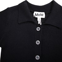 Langärmliges schwarzes Kleid aus einer gerippten Wolle- und Baumwollmischung. Das Kleid hat einen kleinen Kragen, kleine Knöpfe vorne und Falten im Rock, die Volumen verleihen.