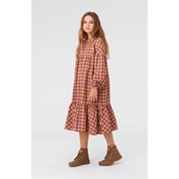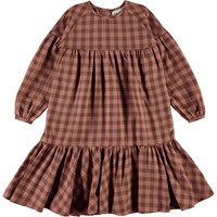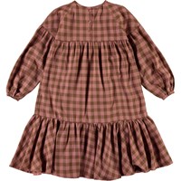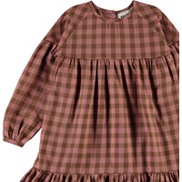 Cecily ist ein Baumwollkleid in Rosa und Braun kariert. Das Kleid hat lange Ärmel und einen drapierten Rock.
