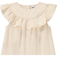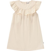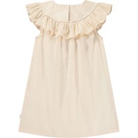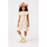 Knielanges beiges A-Linien-Kleid aus Öko-Baumwolle mit Rüschenbesatz, Cap-Ärmeln und Knopfverschluss am Nacken.