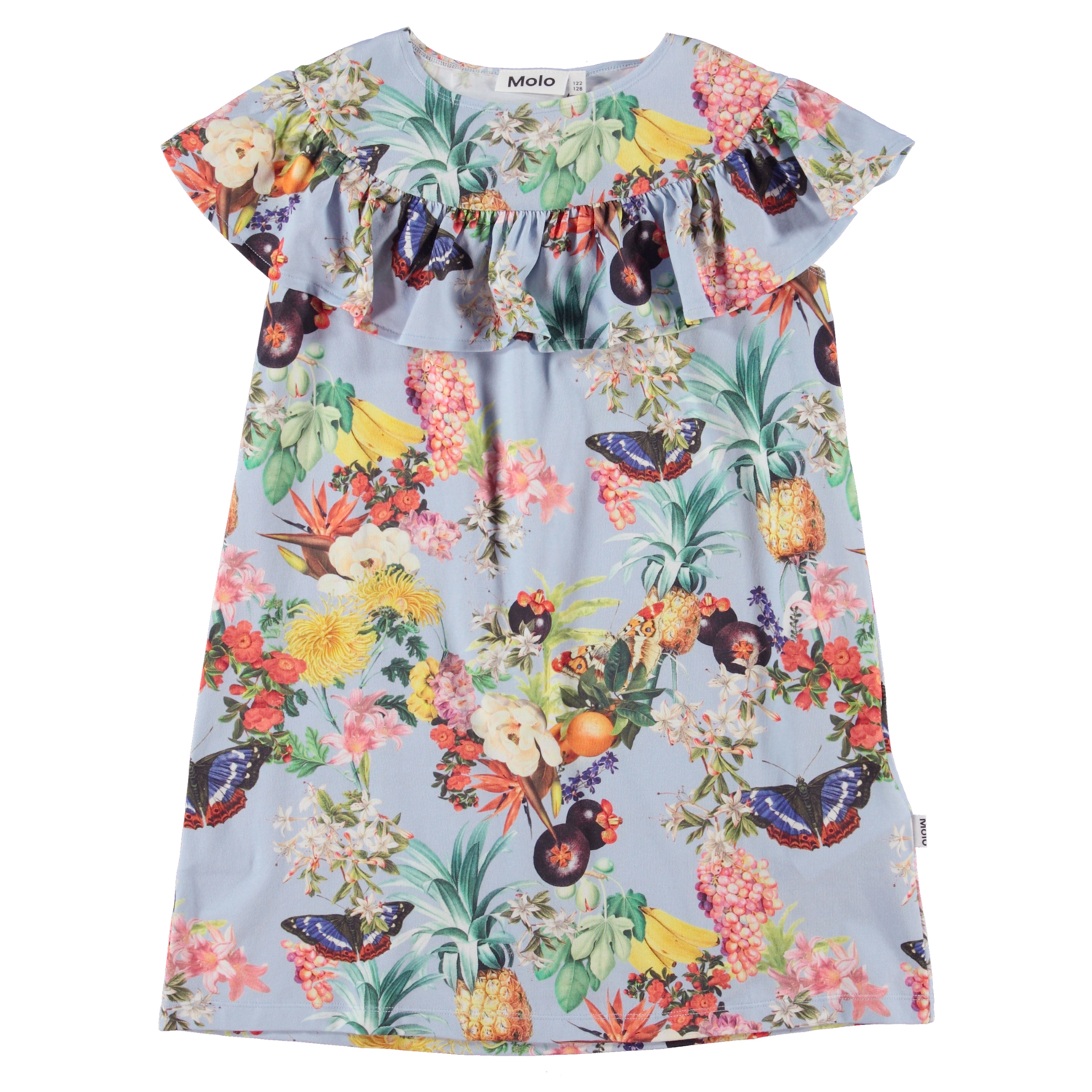 Celia ist ein kurzärmliges, hellblaues Kleid aus Öko-Baumwolljersey. Das Kleid hat eine Passe an Hals und Schulter mit einer angebrachten Rüsche, die rundum geht und die kurzen Ärmel des Kleides bildet. Celia ist in einem Allover-Print mit Ranken aus tropischen Früchten, tropischen Blumen und Schmetterlingen.