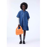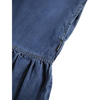 Kurzes, blaues Jeanskleid mit kurzen Ärmeln in Oversize-Passform. Das Kleid hat eine Knopfleiste und eine kleine Tasche vorne sowie einen angesetzten kleinen Rüschenrock.