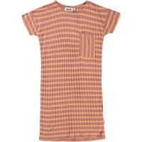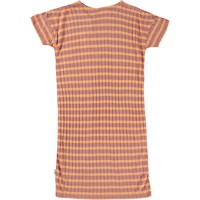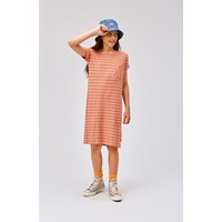 Ceria ist ein knielanges T-Shirt-Kleid aus Rippstrick und 100 % Viskose. Das Kleid hat orange und staubrosa Querstreifen und eine Brusttasche mit vertikalen Streifen.