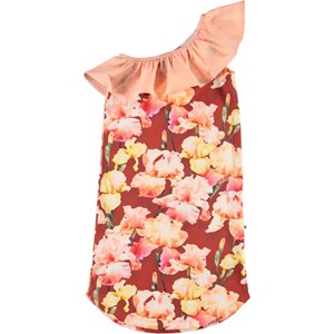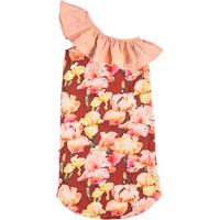 Schönes asymmetrisches Öko-Sommerkleid aus 100% Öko-Baumwolle. Das Kleid hat einen schönen schrägen Schnitt mit einem großen pfirsichfarbenen Rüschenkragen und einem Druck von Irisblüten in Rottönen.
