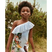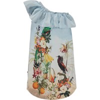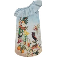 Chadee ist ein asymmetrisches Kleid in Blau mit einem Aufdruck aus tropischen Früchten und Vögeln. Das Kleid hat einen schönen schrägen Schnitt mit einem großen Rüschenkragen.
