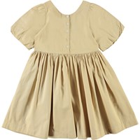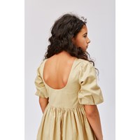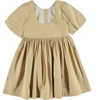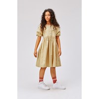 Chaka ist ein beiges, knielanges Kleid aus 100 % Baumwolle. Das Kleid hat kurze Ärmel mit Puffärmeln, einen Knopfverschluss mit weißen Knöpfen auf der Vorderseite und einen tieferen Rücken auf der Rückseite.