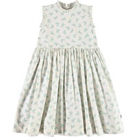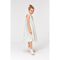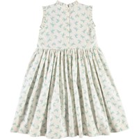 Charlette ist ein weißes Popeline-Baumwollkleid mit Prints von kleinen hellblauen Pferden. Das Kleid hat plissierte Kanten an Armloch und Kragen sowie einen Knopfverschluss im Rücken.