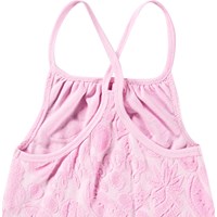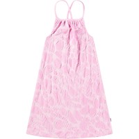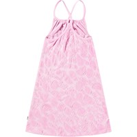 Knielanges rosa Kleid mit einem Muster aus exotischen Früchten aus weichem Baumwollfrottee. Das Kleid hat eine lockere Passform, dünne Träger, die am Rücken gekreuzt sind, und einen runden Ausschnitt mit Raffungen. Das Material des Kleides trocknet schnell und ist ideal für den Pool oder den Strand.