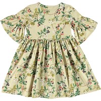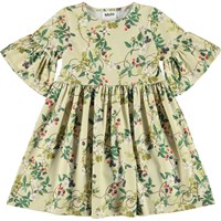 Chasity ist ein hellgrünes Kleid mit Aufdrucken feiner Brombeerranken. Das Kleid hat voluminöse Ärmel, die dem Kleid eine schöne Silhouette verleihen.