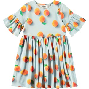 Leichtes knielanges Kleid in weichem Öko-Baumwolljersey in Hellblau mit einem Rundhalsausschnitt und langen T-Shirt-Ärmeln mit Rüschen. Das Kleid hat ein Allover-Muster aus reifen Aprikosen.