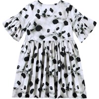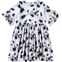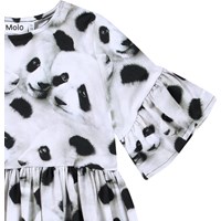 Knielanges Kleid aus weichem Öko-Baumwoll-Jersey mit einem Rundhalsausschnitt und langen T-Shirt-Ärmeln mit Rüschen. Das Kleid hat eine lockere Passform mit einem schwarz-weißen Panda-Print.