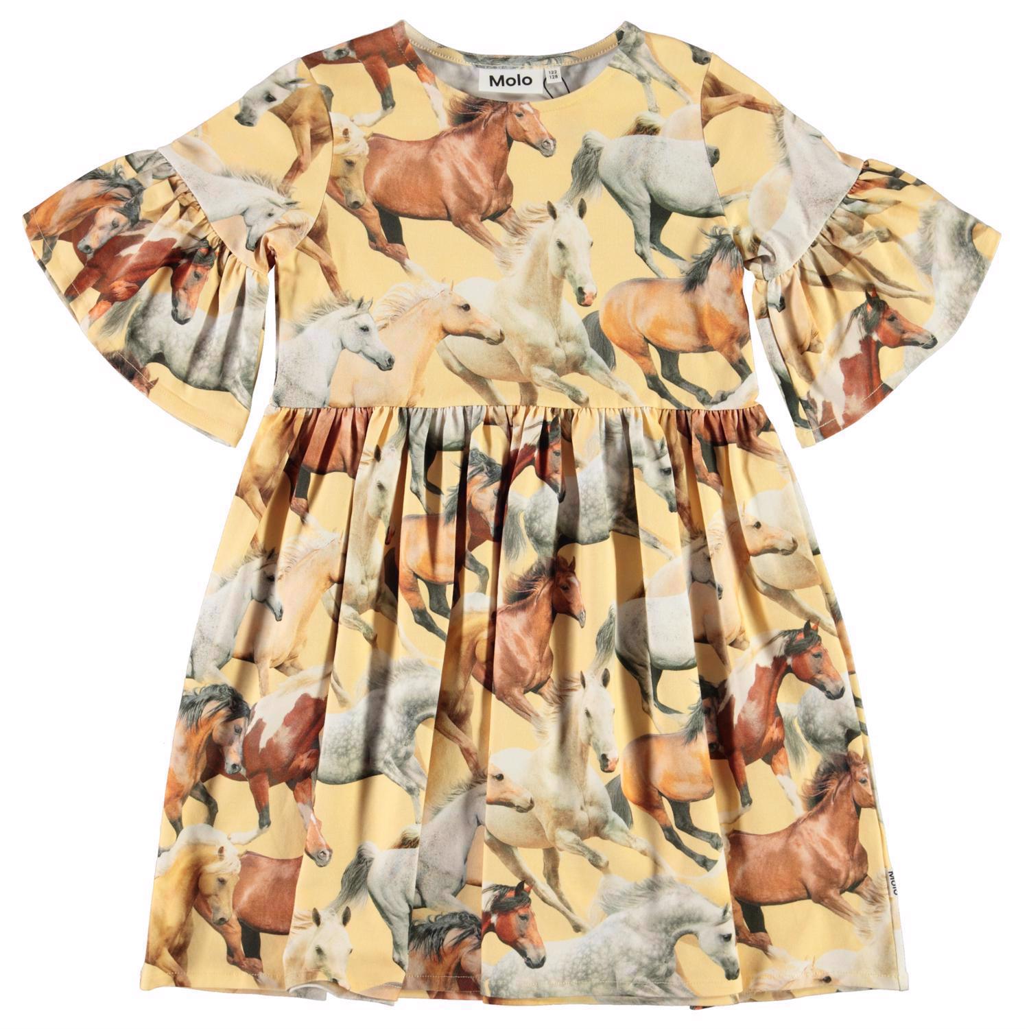 Chasity ist ein hellgelbes Kleid mit Pferdeaufdruck. Das Kleid hat voluminöse Ärmel, die dem Kleid eine schöne Silhouette verleihen.