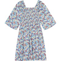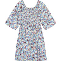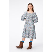 Hellblaues Kleid mit Allover-Print aus bunten Blumen. Das Oberteil des Kleides hat einen quadratischen Ausschnitt, voluminöse Dreiviertelärmel und einen Gummizug am unteren Ende. Das Oberteil ist mit einem elastischen Smok-Effekt genäht, der das Anziehen erleichtert und ein angenehmes Tragegefühl gewährleistet. Der Rock ist in der Taille angenäht und hat viel Volumen.