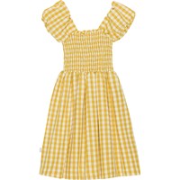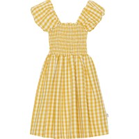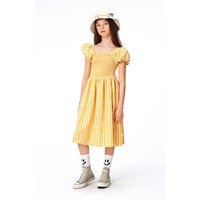 Weiß-maisgelb kariertes Kleid. Der obere Teil des Kleides hat einen quadratischen Ausschnitt und kurze Ärmel mit Puffeffekt. Das Oberteil ist mit einem Smok-Effekt genäht, es verleiht dem Rock eine Faltenbildung und ein schönes Volumen.