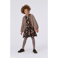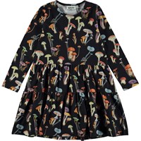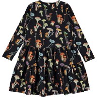 Schwarzes knielanges Kleid mit Allover-Pilzdruck. Der Druck besteht aus einer schönen Auswahl an Pilzen nach einem Herbstspaziergang im Wald. Grafisch, schön und einfach. Dieses Kleid ist aus 100% Baumwolle, hat einen Rundhalsausschnitt, lange Ärmel, einen gerafften Rock mit viel Schwung und eine normale Passform.