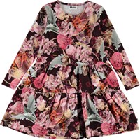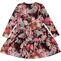 Chia ist ein blumiges Jerseykleid in Burbunderot- und Rosatönen. Das Kleid hat lange Ärmel und einen drapierten Rock mit schönem Volumen.
