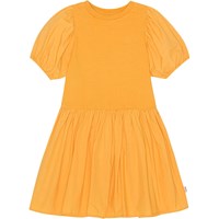Knielanges orangefarbenes Kleid aus Öko-Baumwolle mit kleinem Kleeblatt-Print auf der Brust. Das Oberteil ist aus weichem Jersey mit Rundhalsausschnitt und kurzen, voluminösen Ärmeln mit Gummizug unten. Der Rock ist an der Hüfte gerafft und hat ein schönes Volumen.