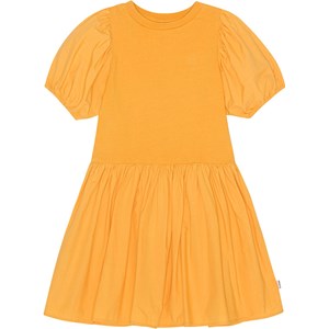 Knielanges orangefarbenes Kleid aus Öko-Baumwolle mit kleinem Kleeblatt-Print auf der Brust. Das Oberteil ist aus weichem Jersey mit Rundhalsausschnitt und kurzen, voluminösen Ärmeln mit Gummizug unten. Der Rock ist an der Hüfte gerafft und hat ein schönes Volumen.