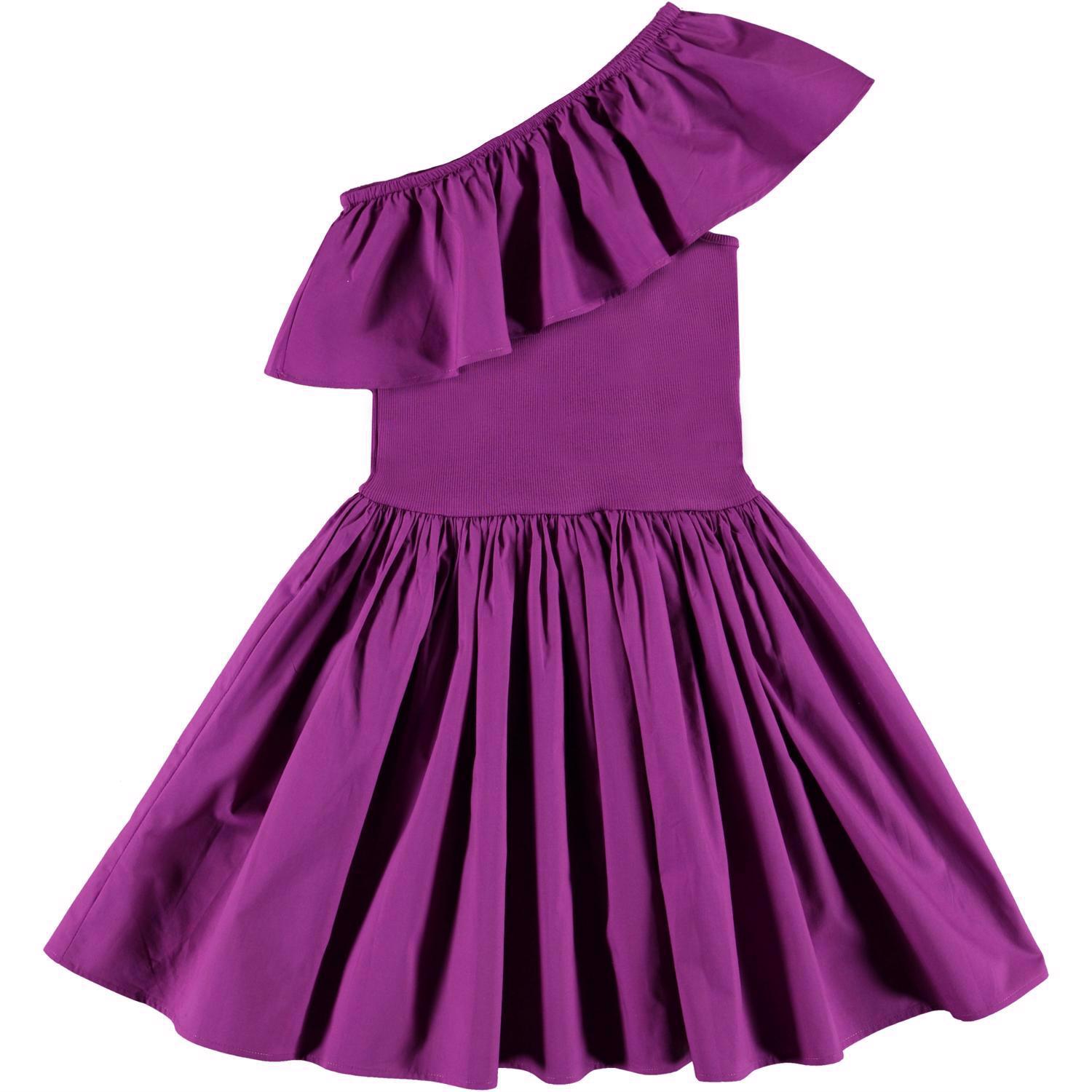 Chloey ist ein lila Traum von einem Kleid. Das Kleid ist asymmetrisch mit einer Rüschenkante über einer Schulter. Das Oberteil des Kleides ist gerippt, während der Rock aus Öko-Baumwollpopeline besteht, die ein schönes Volumen hat.