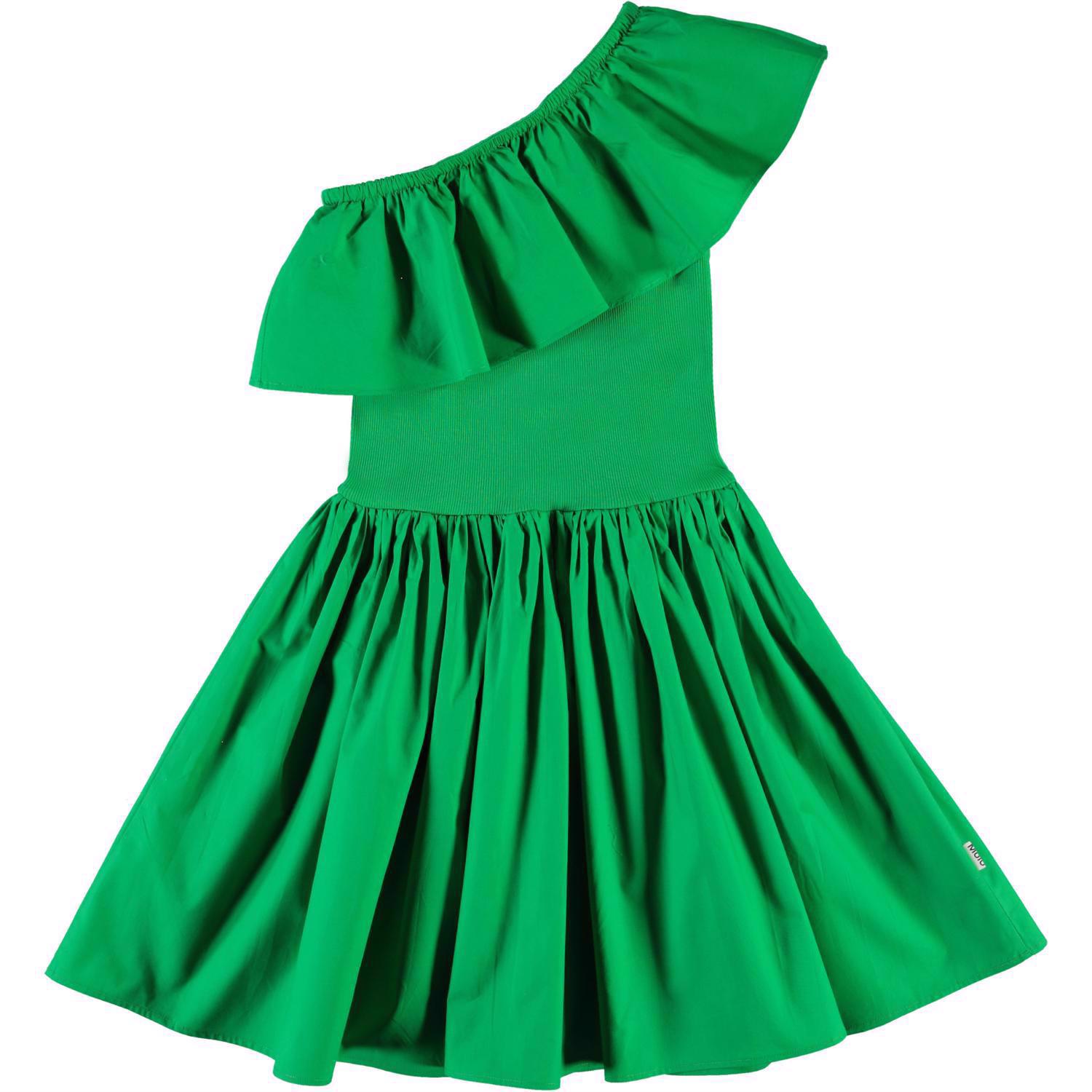 Chloey ist ein grüner Traum von einem Kleid. Das Kleid ist asymmetrisch mit einer Rüschenkante über einer Schulter. Das Oberteil des Kleides ist gerippt, während der Rock aus Öko-Baumwollpopeline besteht, die ein schönes Volumen hat.